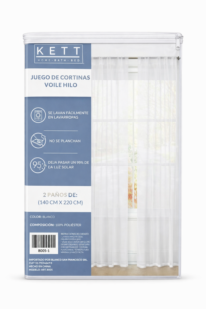 • Tela: Voile Hilo • Trama: Lisa. • Composición: 100% Poliester • Medidas: 140 x 220 Cms Medidas Aproximadas. • Sistema: Presilla Escondida • Incluye: 2 paños de 140 x 220 Cms cada uno • Marca: KETT • Origen: China.
